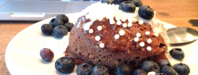Eens iets anders met havermout? Dan is de mugcake iets voor jou! Weer zo’n supersimpele basis van maar 3 ingrediënten: 3 eetlepels havermout, 1 geprakte banaan en 1 ei, of twee eiwitten. En natuurlijk heb je een mok nodig. Doe de geprakte banaan en de havermout in de mok en roer goed door. Doe dan het ei erbij en roer nog eens, echt goed, door. Dit is de basis. Wanneer je dit 2 minuten in de magnetron zet op ongeveer 900 watt dan is je mug cake klaar. Varieer er weer op los. Vanochtend heb ik er een klein schepje vanille whey, pindakaas en chocopoeder doorheen geroerd en bestrooid met blauwe bessen. Jum! Maar ook kaneel doet het erg goed. Wat is jouw favo mugcake?