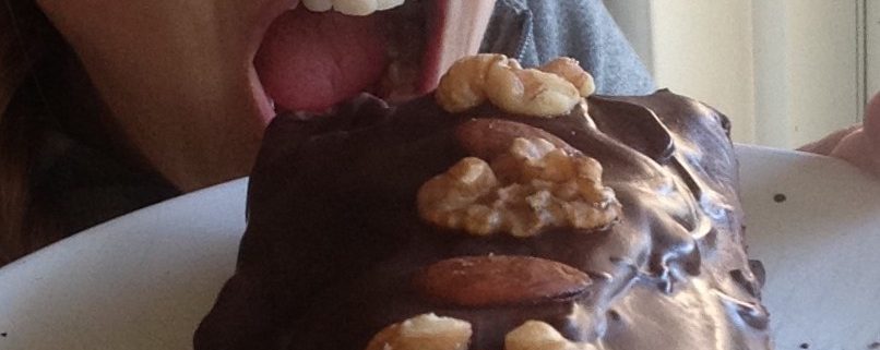 Om het helemaal af te maken smeer je nog een flinke laag chocolade over de cake heen. Laat de cake eerst afkoelen voordat je dat gaat doen. Om de chocoladetopping te maken zet je een pannetje op het vuur met water erin. In het pannetje hang je een schaal die het water niet raakt. We gaan de boter en chocolade ‘au-bain-marie’ smelten. Wacht totdat het water koot. Zet het vuur dan wat lager en hang het schaaltje in de pan. Smelt nu de boter eerst in het schaaltje en doe er dan de chocolade in blokjes bij. Roer dit door met een spatel. Ik gebruik zo’n zacht plastic ‘pannenlikker’. Wanneer de choco is gesmolten pak je met ovenhandschoenen het schaaltje van de pan. Gebruik nu de pannenlikker of een eetlepel om de chocolade ruim over de cake heen te smeren. Smeer ook de zijkanten in. Leg er nu om en om de noten op en laat langzaam afkoelen. Nomnomnom! Genietse.